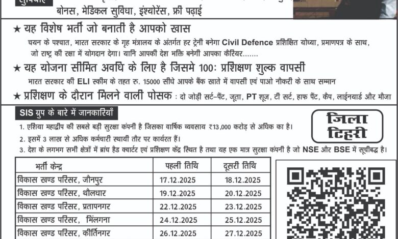 05 जनवरी एवं 06 जनवरी को नरेंद्रनगर (फकोट) में प्रातः 11 बजे से अपराह्न 03 बजे तक शिविर का आयोजन किया जायेगा, जिसमें शारीरिक मापदंड एवं मौखिक परीक्षा लेने के बाद चयनित उमीदवार का पंजीकरण किया जायेगा और चयनित उमीदवार ट्रेनिंग के लिए SiS ट्रेनिंग सेंटर देहरादून सेलाकुई जायेंगे, वहा 1 माह की ट्रेनिंग होगी, उसके पश्चात उनकी पोस्टिंग वंही से की जायेगी। जो बच्चे अपने ब्लॉक के शिविर में नही पहुँच पाए, वह हमारे दूसरे शिविर में भाग ले सकते है।